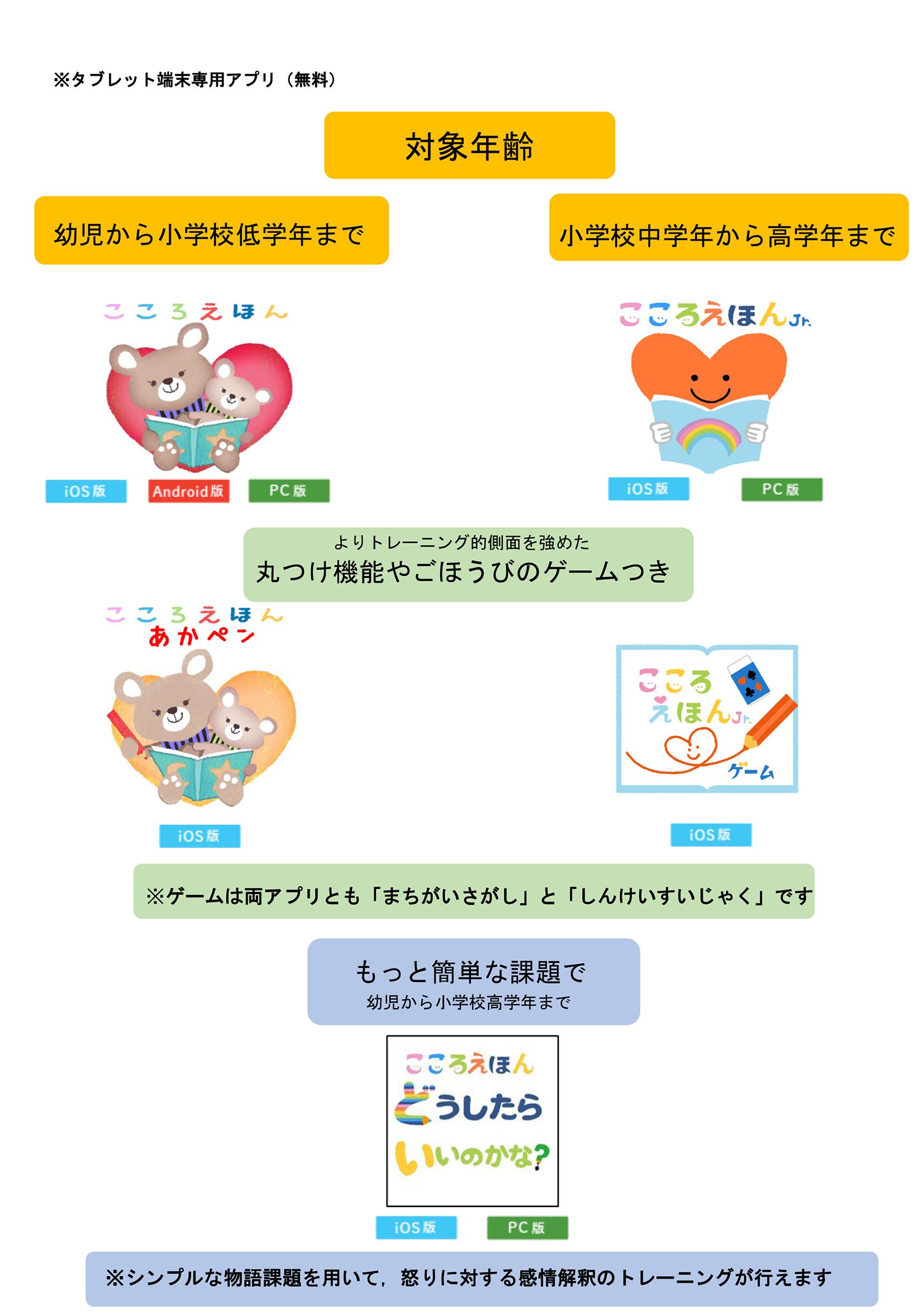 「こころえほん」シリーズは、幼児から児童(発達に特性のあるお子さんを含む)の他者の気持ちを思いやる力(役割取得能力)を促すことを目的とした、iOSタブレット端末専用の絵本アプリです。トレーニングにより、こどもたちの園および学校への適応を促し、園・学校生活の充実に寄与することを目指して開発されました。こどもと大人が一緒にトレーニングを行い1台の端末をシェアすること、こどもの視力への影響を考慮し、iOSタブレット端末専用の教材です(スマートフォンには対応しておりません)。